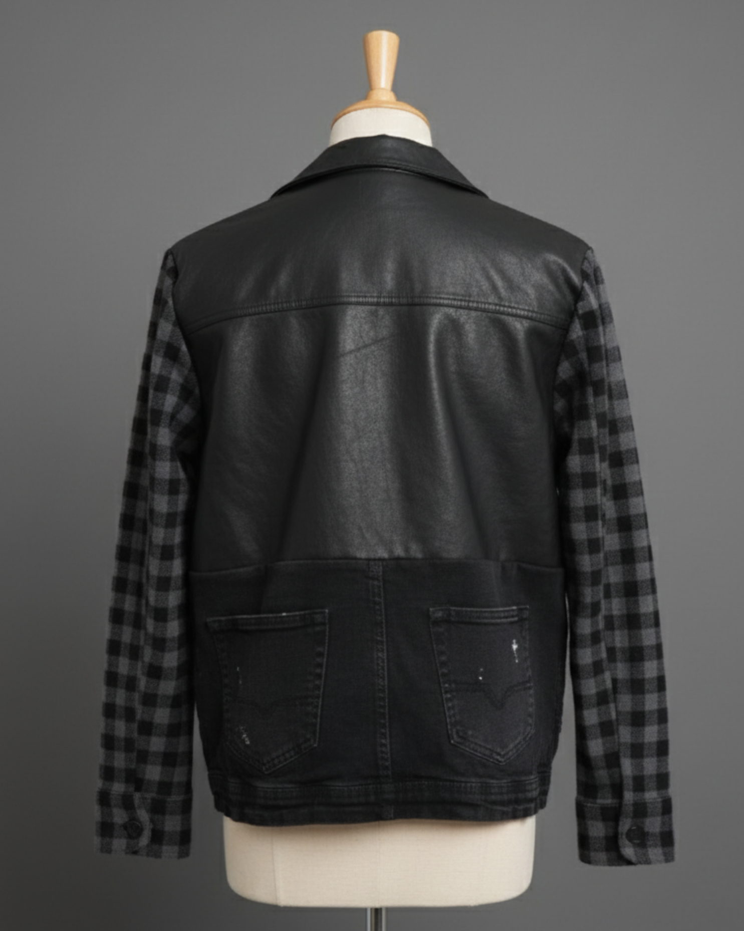Fusion Layer Jacket” memadukan tiga karakter bahan dalam satu karya: kekuatan kulit, ketegasan denim, dan kehangatan flanel.